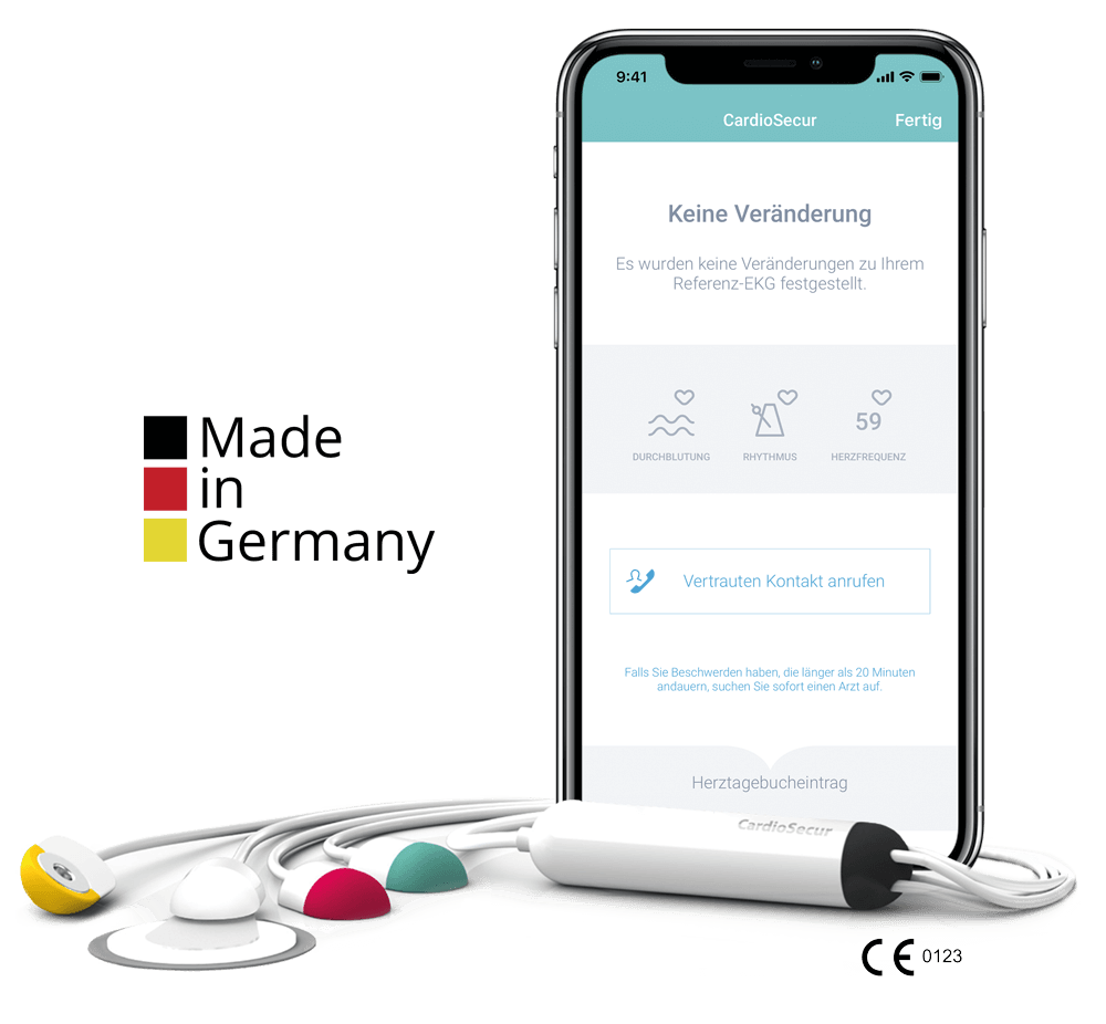 CardioSecur Pro is a mobile, 22-lead ECG (feature with surcharge) that is connected to an iPhone or iPad. In addition to complex arrhythmias, CardioSecur is the only system that makes it possible to recognise infarcts of the anterior, lateral, and posterior walls of the heart. The depth of analysis is unrivalled.